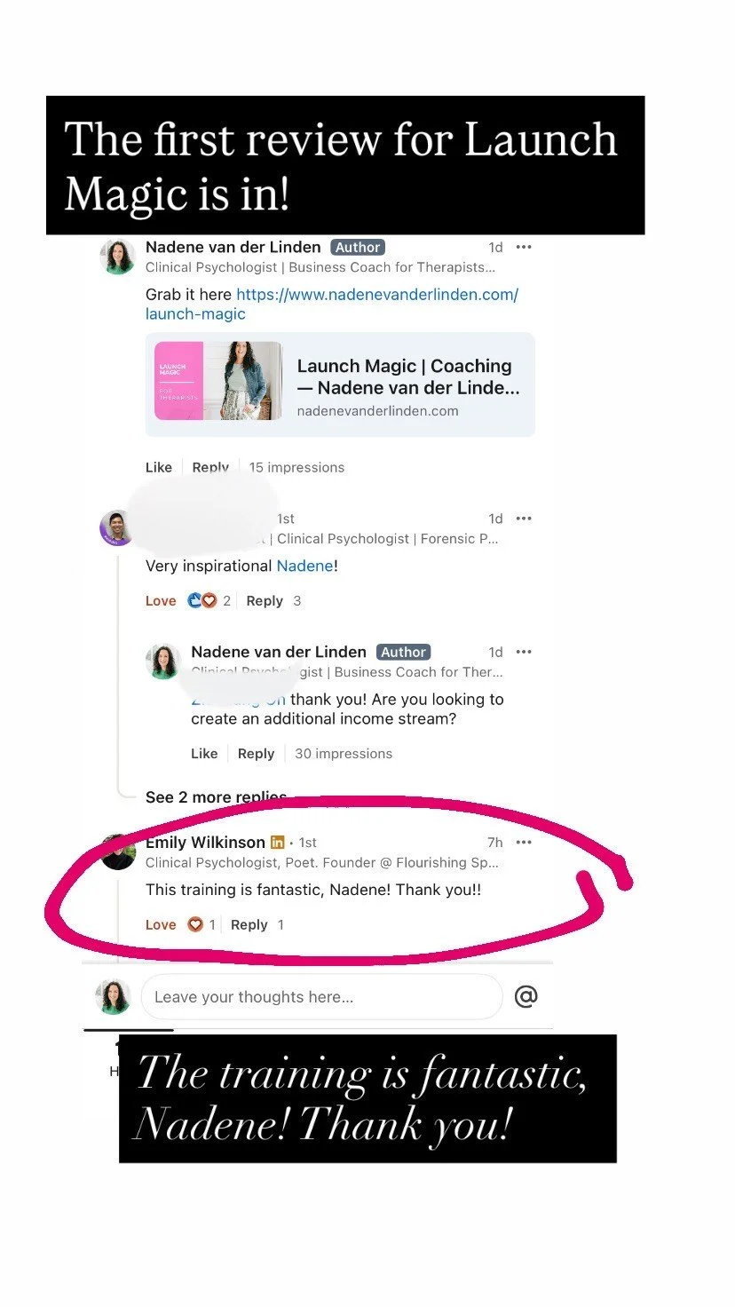 This training is suitable for therapists who have launche before and did not get their desired sales and profit results. Most therapists begin with a haphazard strategy to launching that reduces their sales and profit. Launch Magic guides you to get it right and stick to a plan that is designed to maximise the profit.